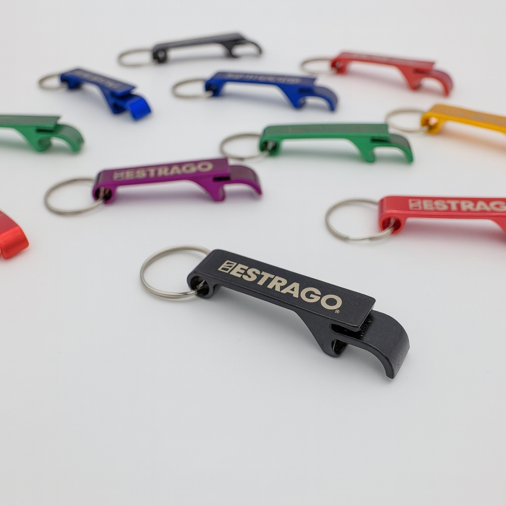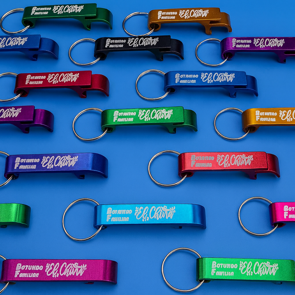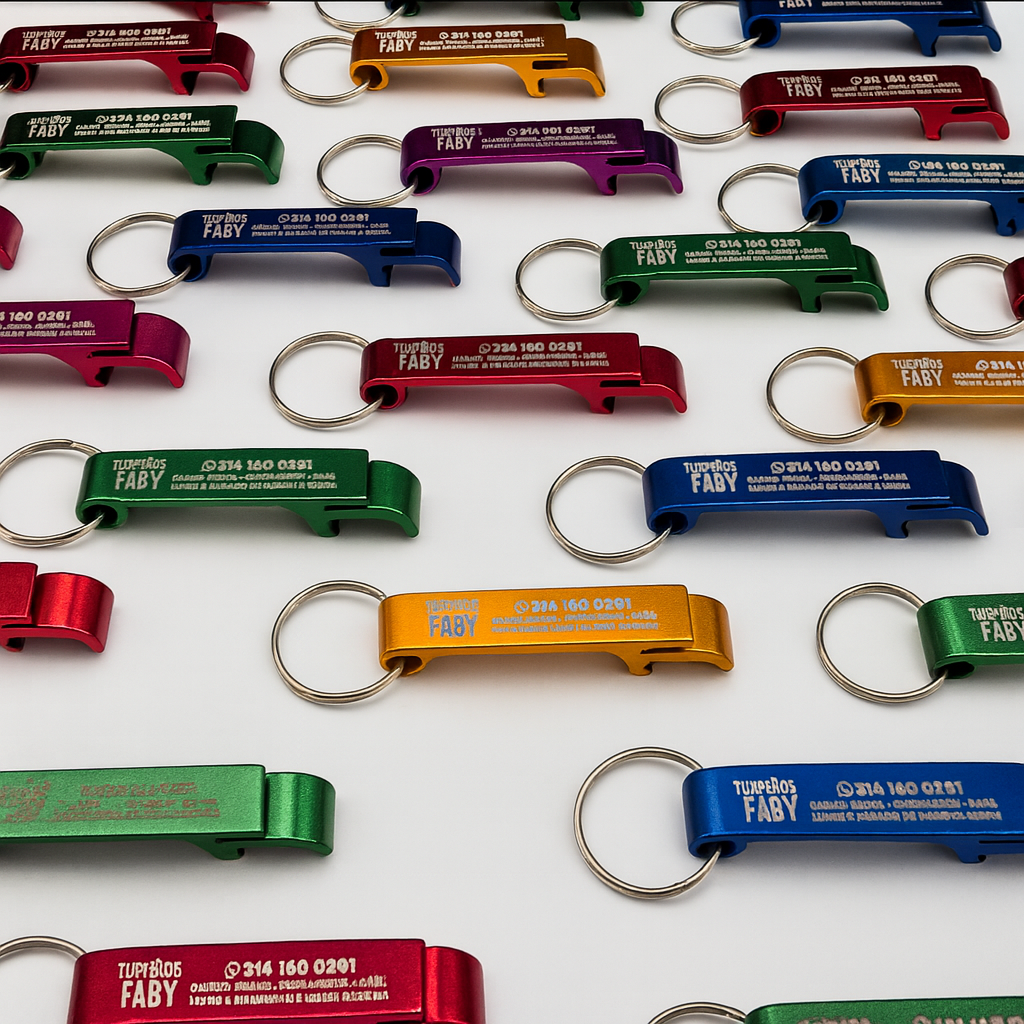 Destapador metálico personalizado con grabado láser, práctico y resistente. Área de grabado de 0.7 cm x 4 cm. Disponible en colores